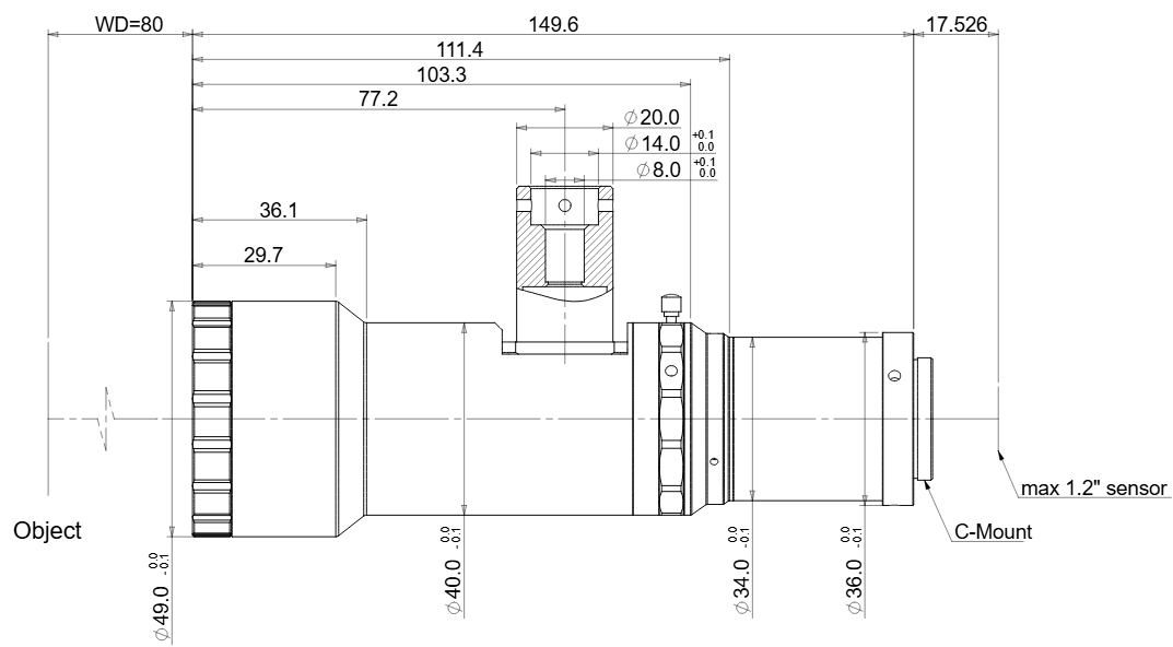 テレセントリックレンズ。1.2″イメージサークルで推奨ピクセルピッチ3.5 – 21.5