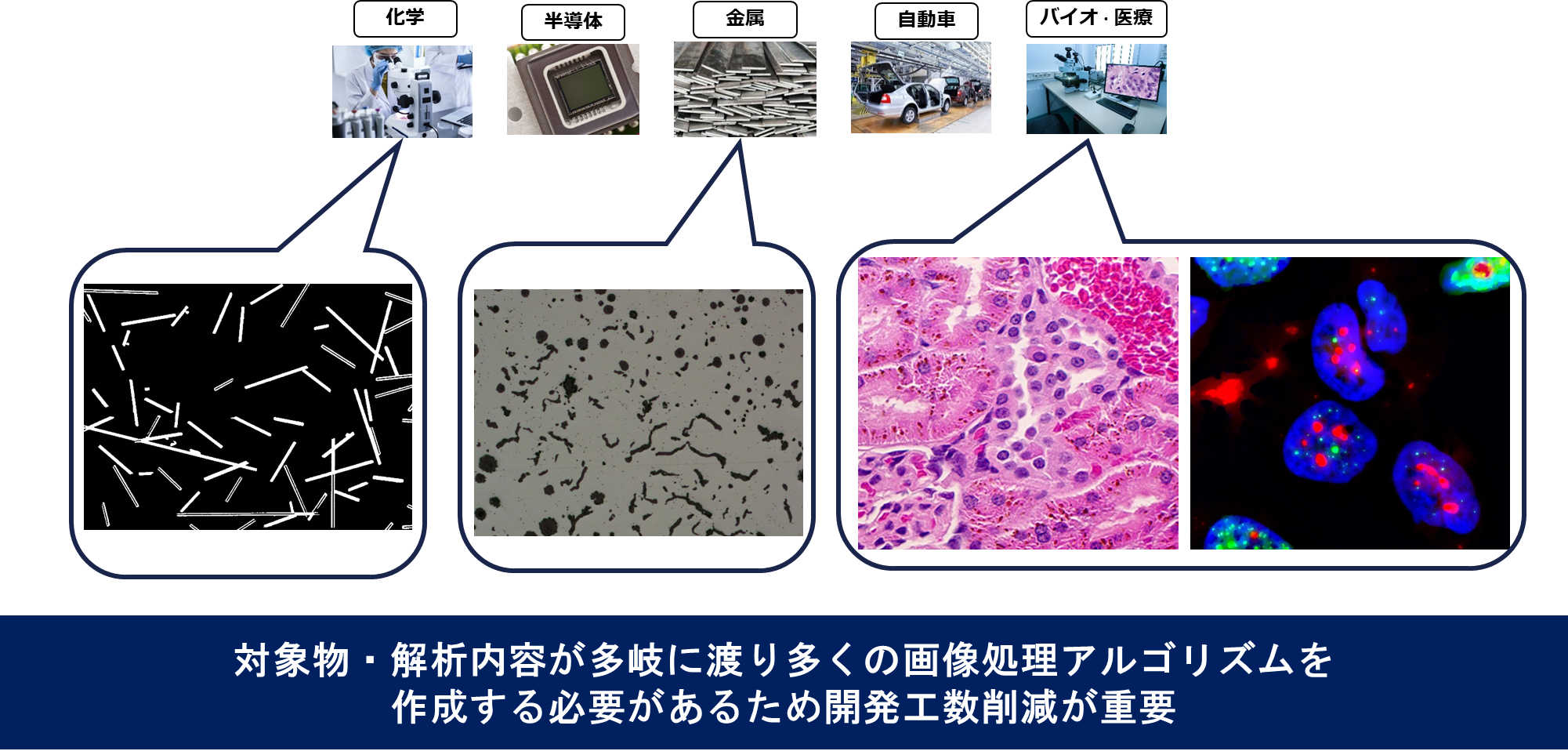 顕微鏡画像解析の現場では、半導体、自動車、化学、バイオ・医療、金属など、対象となる分野が極めて多岐にわたります。それぞれの対象物や解析目的に合わせて、最適な画像処理アルゴリズムを個別に開発する必要があります。