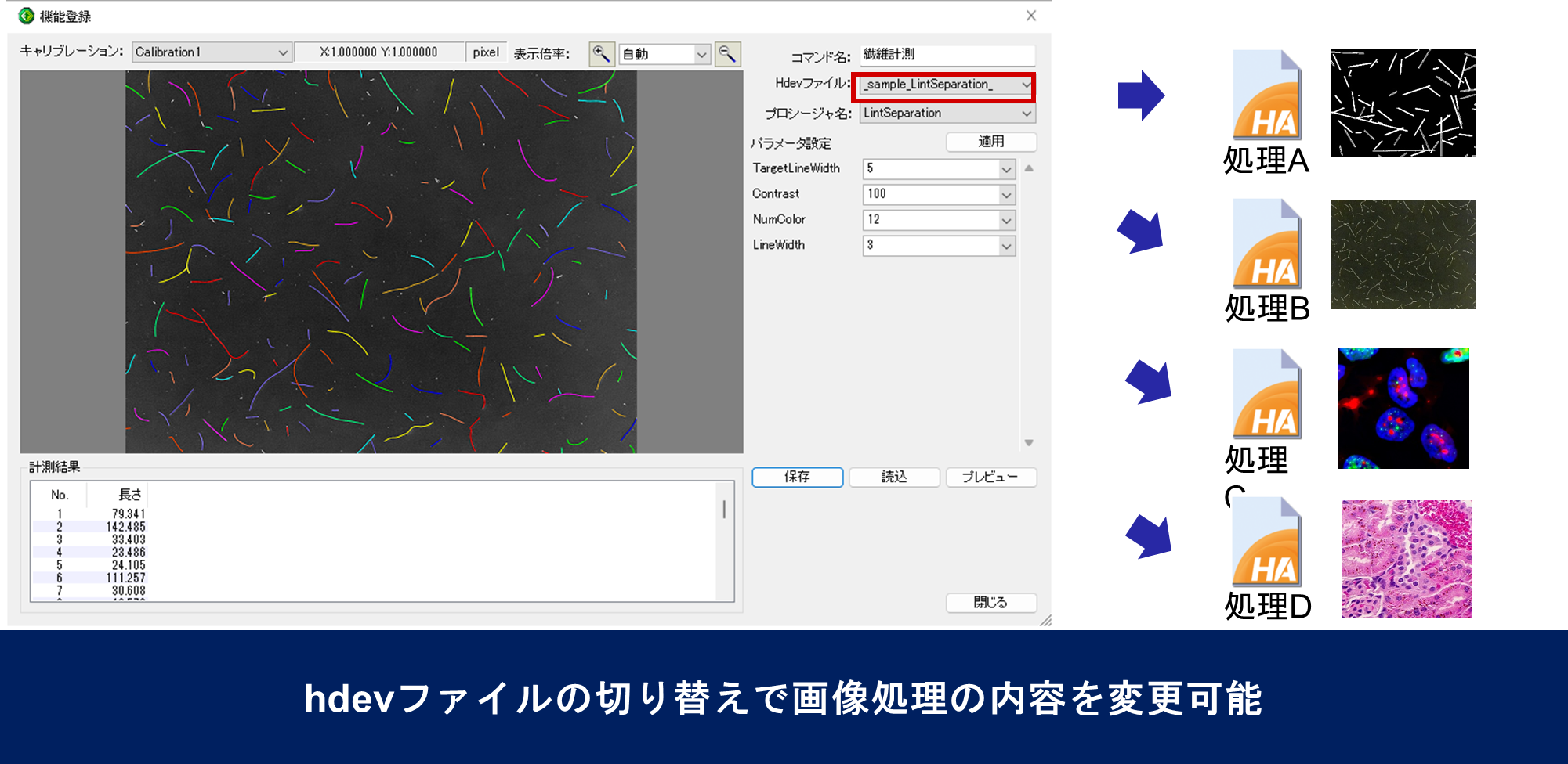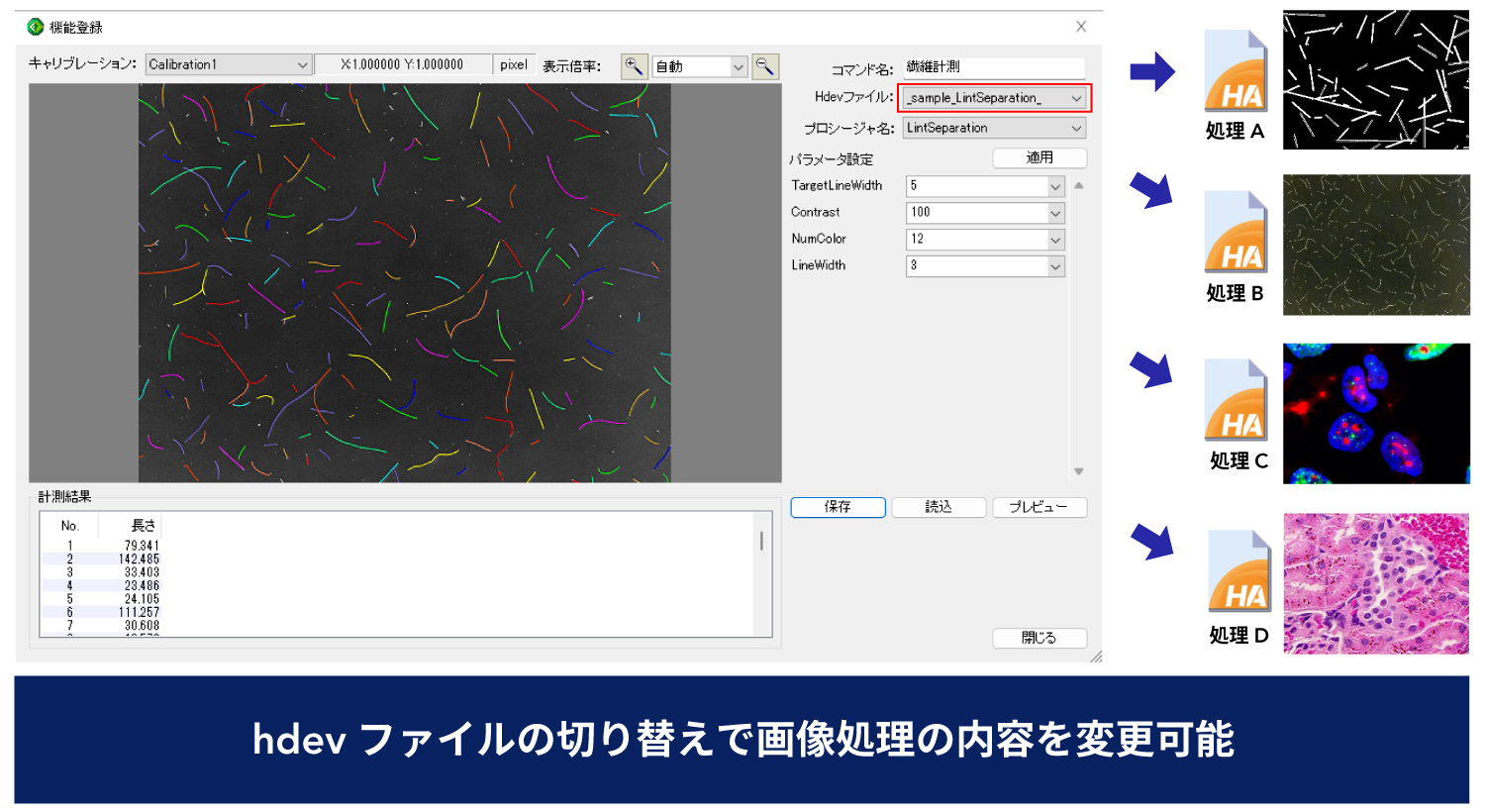 アプリケーションを再起動することなく、読み込む.hdevファイルを切り替えるだけで、実行する画像処理内容を瞬時に変更できます。これにより、「繊維計測」から「粒子解析」へといった処理の切り替えが、ユーザーの操作一つで容易に実現可能となりました。