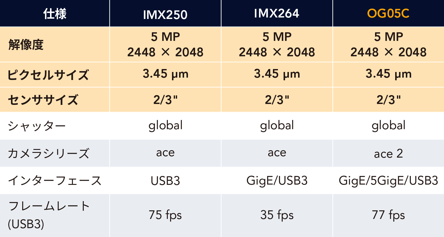 OMNIVISIONのセンサーOG05Cは、ピクセルサイズおよび解像度が互換仕様となっている点が大きな特長です。これにより、光学系の変更なしにカメラの置換が可能となります。また、カメラシリーズがaceからace 2になるため、カメラ機能の拡充もしています。