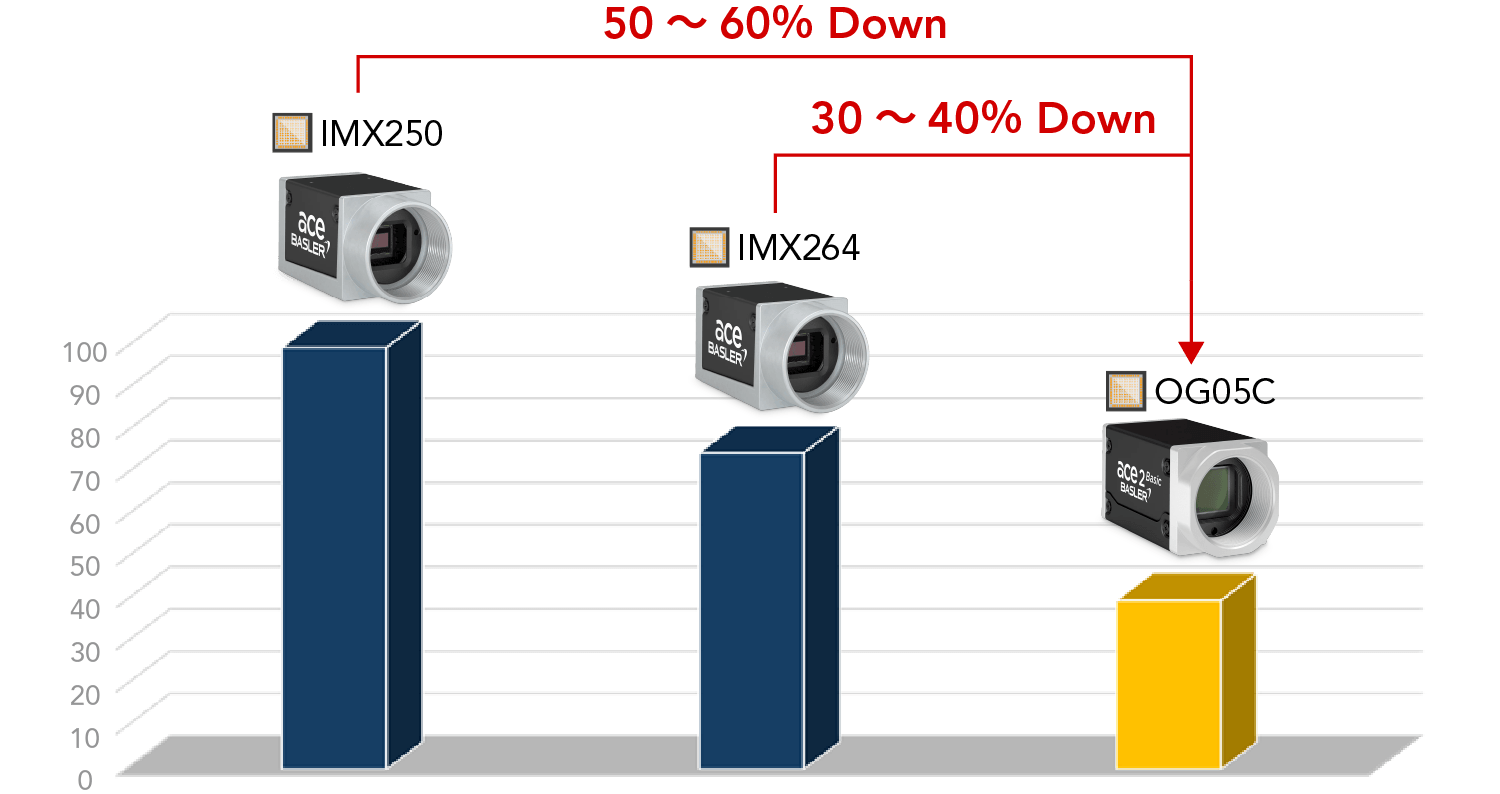 コスト面においては、OG05C搭載カメラは、IMX264/250搭載機種と比較して、最大60%のコスト削減が可能です。