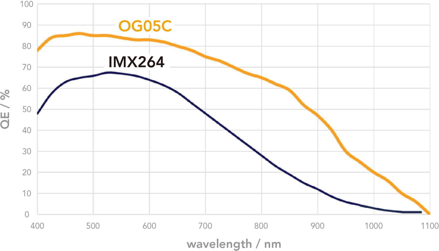 このような高い量子効率特性は、OG05Cが裏面照射構造(BSI)を採用していることによるものです。