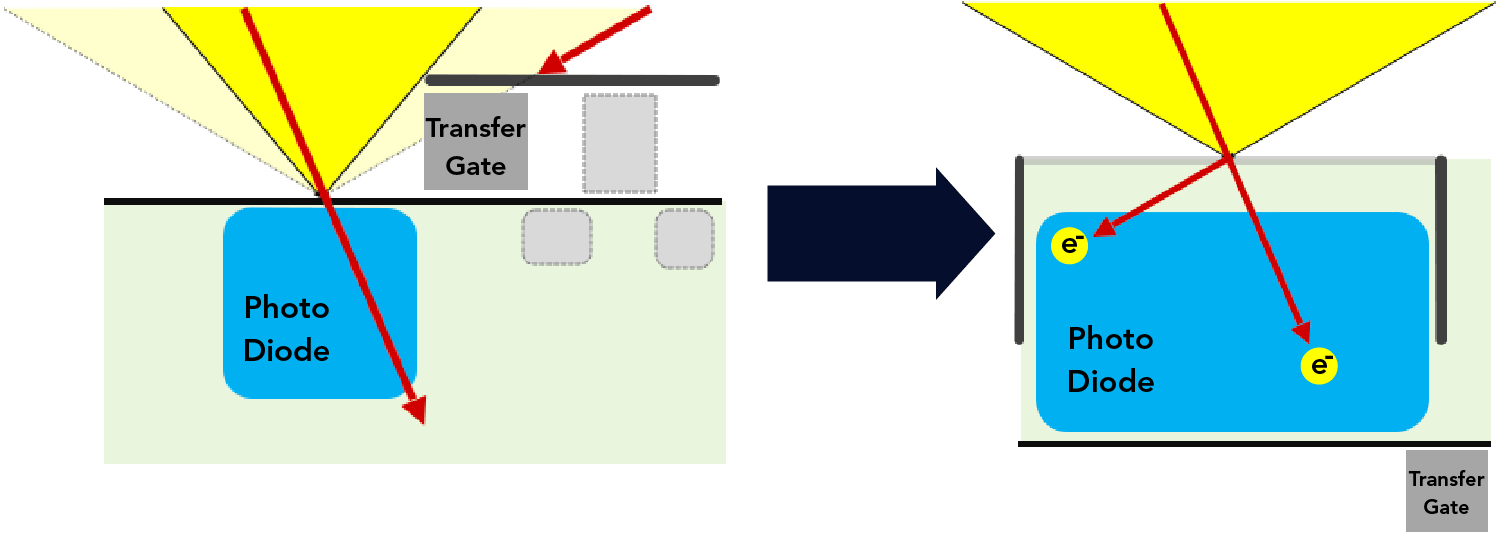 加えてBSIにより、斜入射特性についても改善されており、その構造を下図に示します。フォトダイオードの大きさや配置を最適化することで、斜めに入射した光であってもフォトダイオード外への光の取りこぼしを抑制し、安定した電荷生成を可能としています。