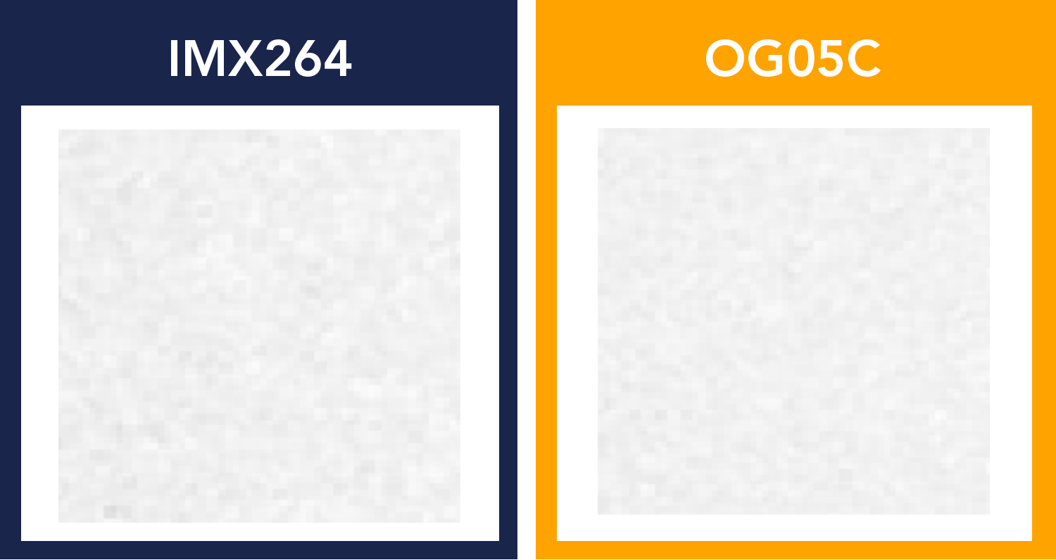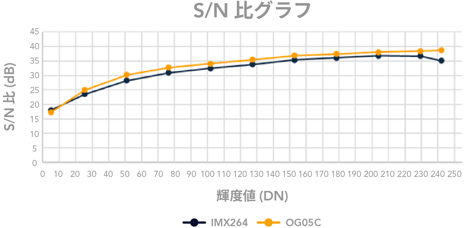 センサースペックにおけるダークノイズ特性はIMX264が2.3−、OG05Cが2.6−であり、数値上はOG05Cのほうがやや不利な値となっています。しかしながら、実測によるS/N比ではOG05Cがわずかに良好な結果を示しました。これは読み出し(Readout)ノイズ特性の改善による影響であると考えられ、ace 2プラットホームにおけるカメラでの回路設計の最適化などにより、センサー単体のスペック値だけでは評価できないカメラ全体としての性能向上が寄与しているものと考えられます。