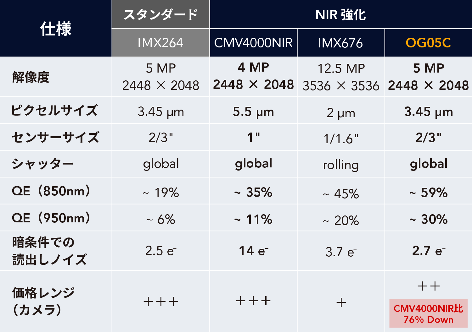 ② NIRに感度があるAms(旧CMOSIS)製4MPセンサー(CMV4000NIR)搭載カメラからの性能向上とコストダウン