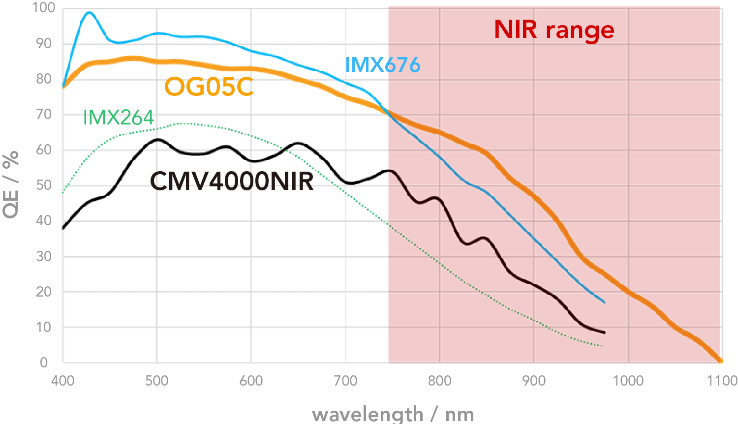 下図は、NIR領域に感度を持つ各種センサーの量子効率を比較したものです。OG05Cは、NIR領域において最も高い量子効率を示しています。
