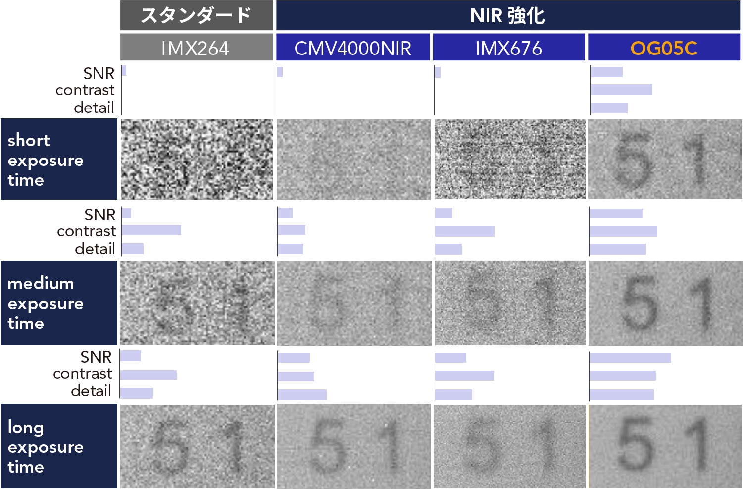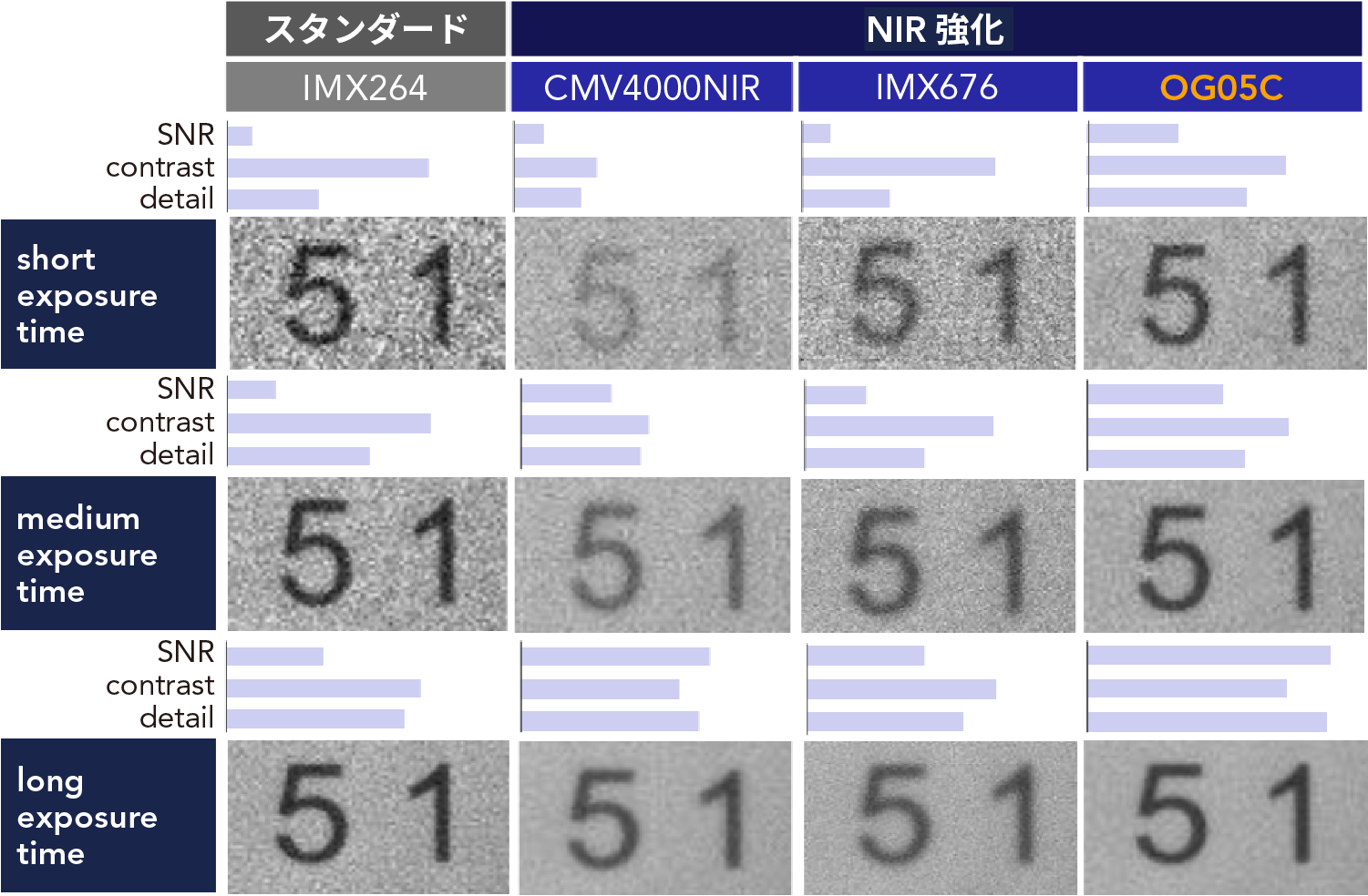 全ての露光条件において、OG05C搭載モデルが最も良好な評価結果を示しました。一般に感度低下が顕著となる長波長域(1100nm)においても、画質性能を維持しています。