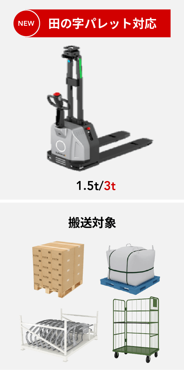 ハンドリフト型AMRは、従来のユーロパレット対応のみではなく、田の字パレットにも対応した機種をリリースします。AGFではサイズも価格もtoo muchになりやすい、床から床へのパレット搬送も本機種により、より省サイズ・小コストで実現可能です。