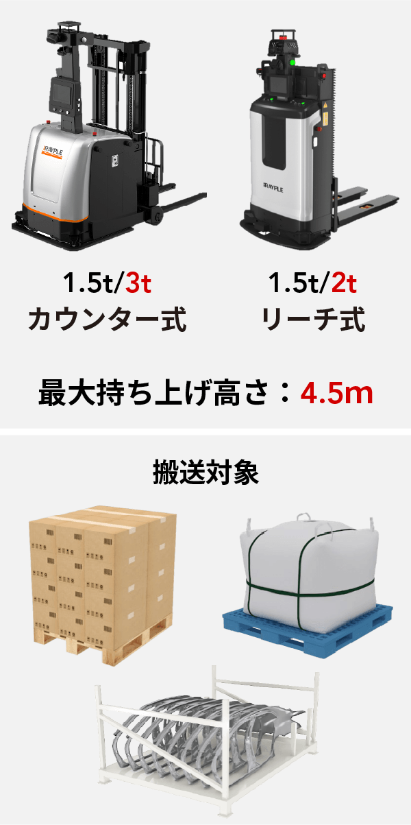 潜り込み式のAMRは、従来の可搬重量2000kgから3000kgへと大幅に重量アップが行われます。1500kgまでの可搬レンジであれば対応可能なメーカーが多い一方、2000kg以上の可搬重量を満たすことのできる車両は未だ数が少ないのが実態です。iRAYPLEはお客様のお役に立つべく、より重量側の機種をリリースします。