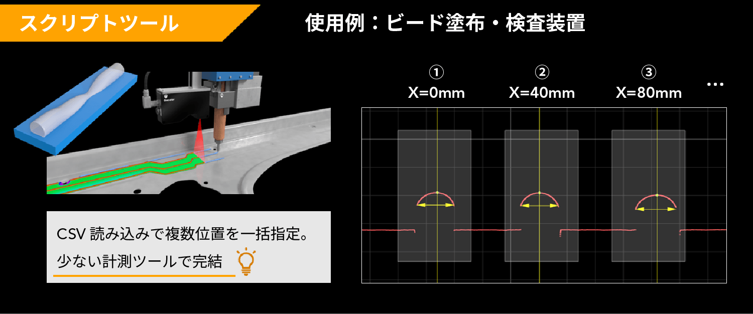 また、接着剤の本数や位置は品種ごとに異なります。そこで、品種ごとの測定領域や測定数をあらかじめCSVファイルに登録し、スクリプトツールで当該CSVファイルを読み込んで、測定領域を動的に変更する仕組みとしました。これにより、設定ファイルを変更することなく、接着剤の本数や位置変動に追随した柔軟な測定が容易に行えるようになりました。