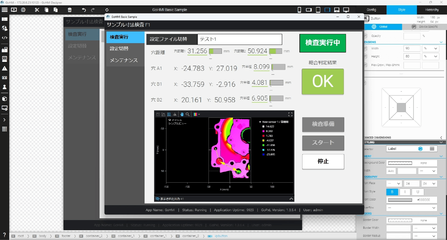 | GoHMIを使用することで、タッチパネル表示モニタ向けの操作インターフェースを簡単に開発できます。基本的なボタン操作や機種切り替えに加え、計測結果に応じた赤/緑の表示切り替えなど、画面を自由にカスタマイズすることが可能です。 また、GoPxL画面に表示される3Dデータのカラーマッピング表示や、3D+2Dの重ね合わせ表示についても、表示画面のURLをコピーするだけで、そのままGoHMI画面上に表示できます。 | ![]() |
