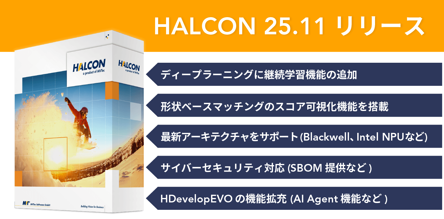 HALCON Progress Editionは、半年ごとに新しい画像処理機能が追加される、進化を続けるソフトウェアパッケージです。11月12日にリリースされた最新版の25.11では、少ない画像枚数でも追加学習が可能な継続学習機能や、ルールベース画像処理で最も重要な形状ベースマッチング機能の性能向上など、実用性の高い新機能が搭載されています。本号では、この25.11の新機能について紹介します。