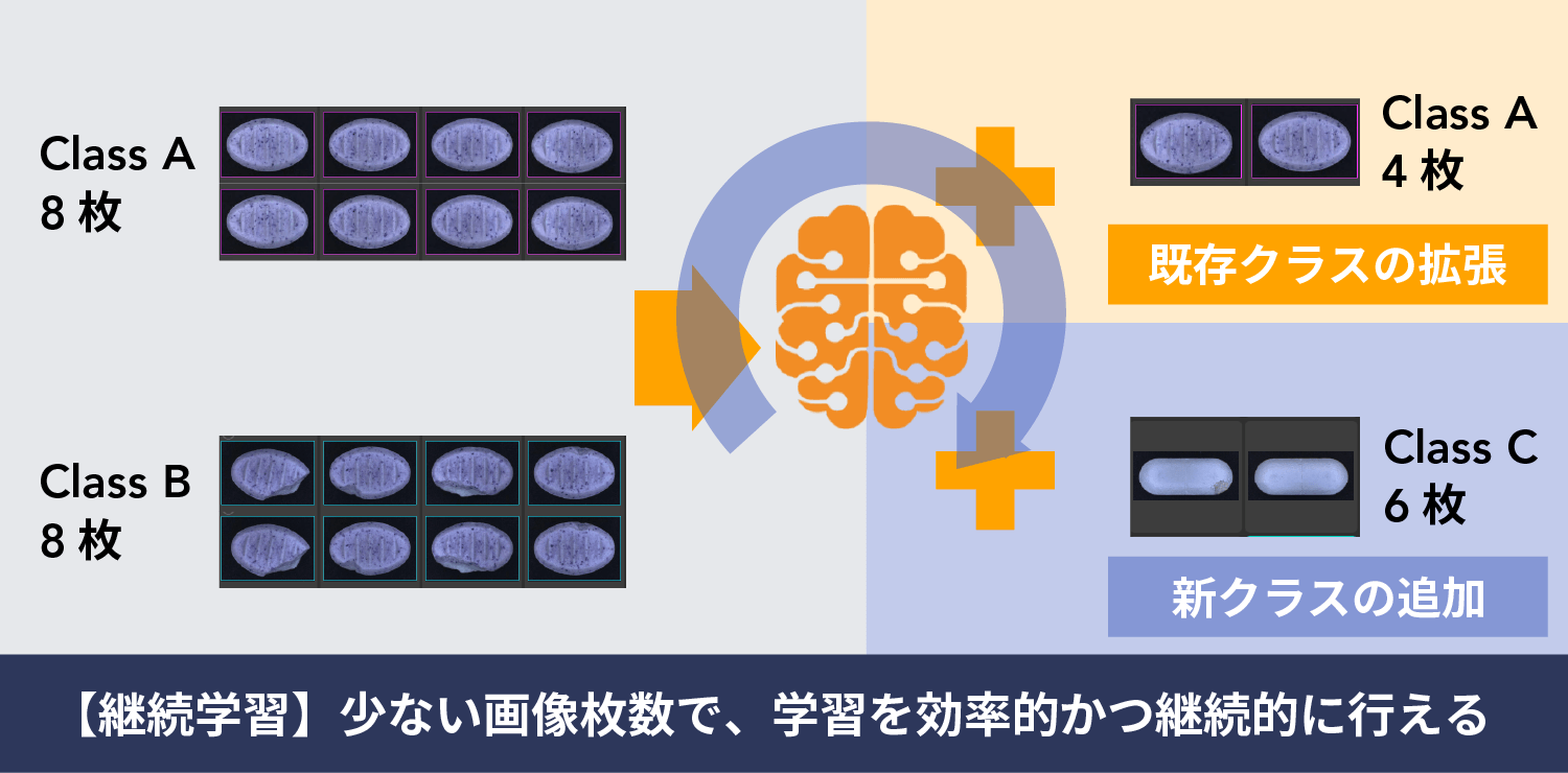 HALCONのディープラーニング機能の一つ、クラス分類機能は、多くのお客様にご利用いただいている実用性の高い機能です。今回、このクラス分類の拡張機能として、継続学習機能が追加されました。こちらを用いることで、①少ない枚数の画像で学習ができ、②後から新しい画像だけで追加学習できたり、③後から新しいクラスを追加したりすることができます。