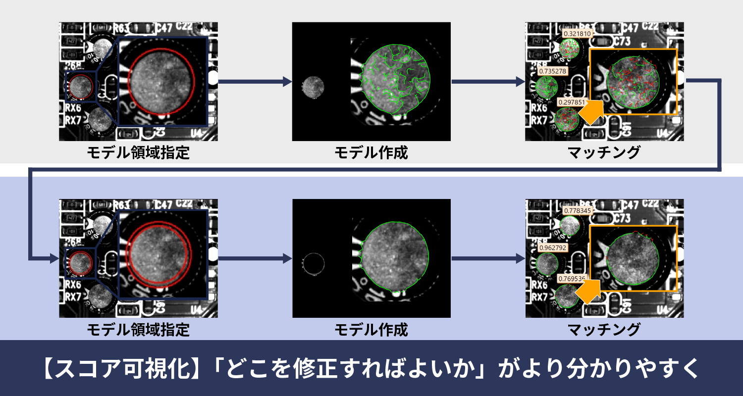 HALCONの形状ベースマッチング機能は、ルールベース画像処理の中でも最も重要な機能の一つです。この形状ベースマッチングの使い勝手をさらに向上させるべく、HALCON 25.11では、スコア可視化機能が搭載されました。これにより、モデルのエッジのうち、スコアカウントに使用されたエッジ、そうでないエッジを確認できるようになり、モデルの品質向上に向けたフィードバックを得ることができます。