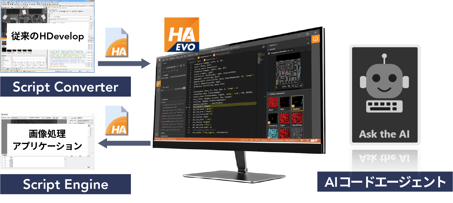 HALCON 25.11には、新しい開発環境HDevelopEVOの最新プレビュー版が搭載されます。従来のHDevelopのスクリプト(hdevファイル)をEVOで読み込めるようにするScript Converterや、HALCONスクリプトをアプリケーションから直接実行できるScript Engineなど、様々な機能が導入されています。