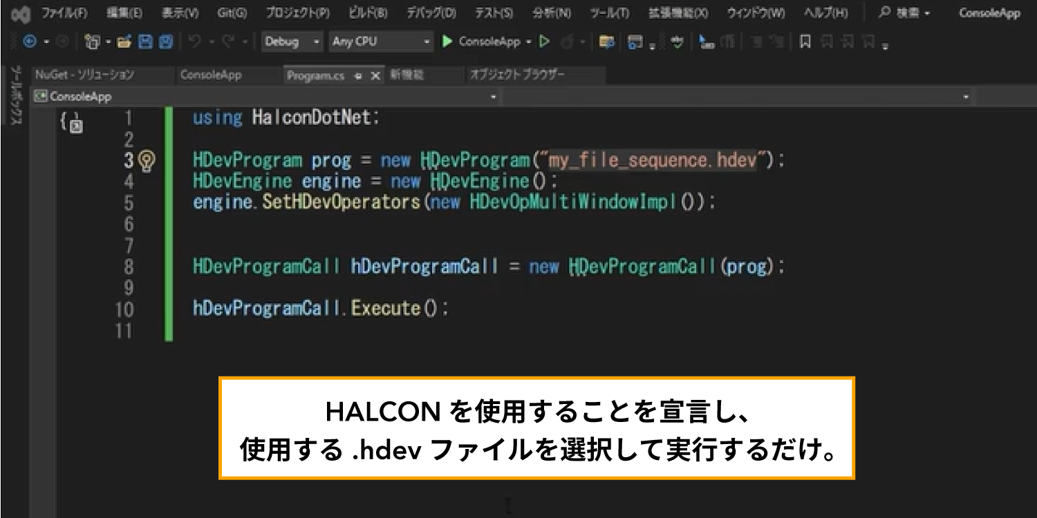 簡単なコードでHDevelopの機能を組み込むことができます。