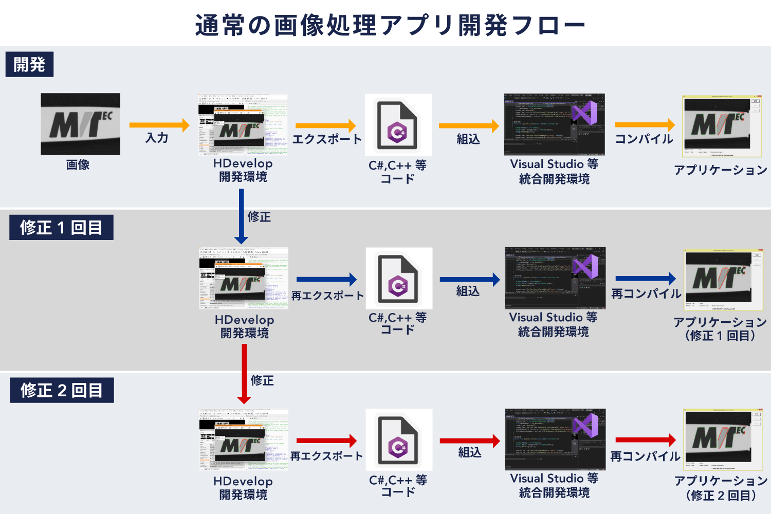 通常の開発フローでは、HDevelopで作成したアルゴリズムをC#、C++などにエクスポートして、Visual Studioなどでコンパイルして、アプリケーションを生成する必要があります。また、画像処理アルゴリズムの修正のたびに、再エクスポートや再コンパイルを行う必要があります。
