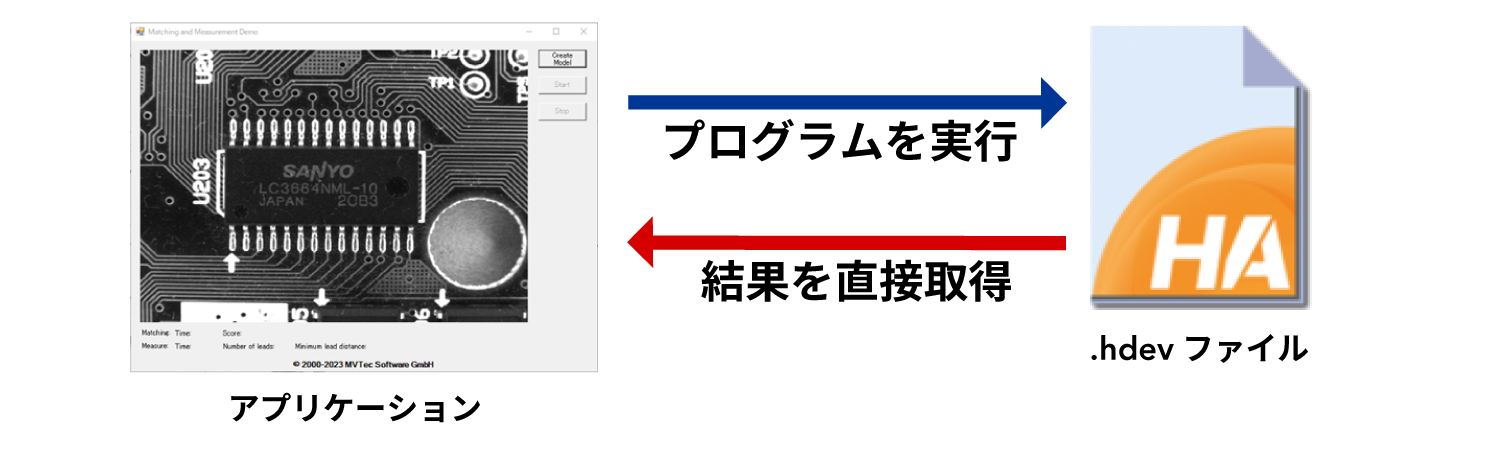 HDevEngineは、HALCONの画像処理開発環境であるHDevelopで作成した画像処理アルゴリズム(.hdevファイル)を、お客様のアプリケーションから直接呼び出して実行できる、という機能です。