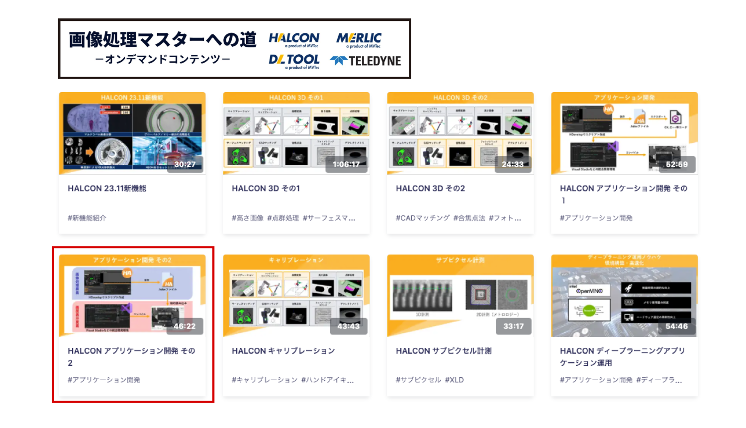 ※HALCONオンデマンドトレーニング内の「HALCON アプリケーション開発 その2」が、HDevEngineについて解説した動画です。HDevEngine以外にもHALCONの便利な機能を紹介する動画を多数ご用意しておりますので、併せてご活用ください。