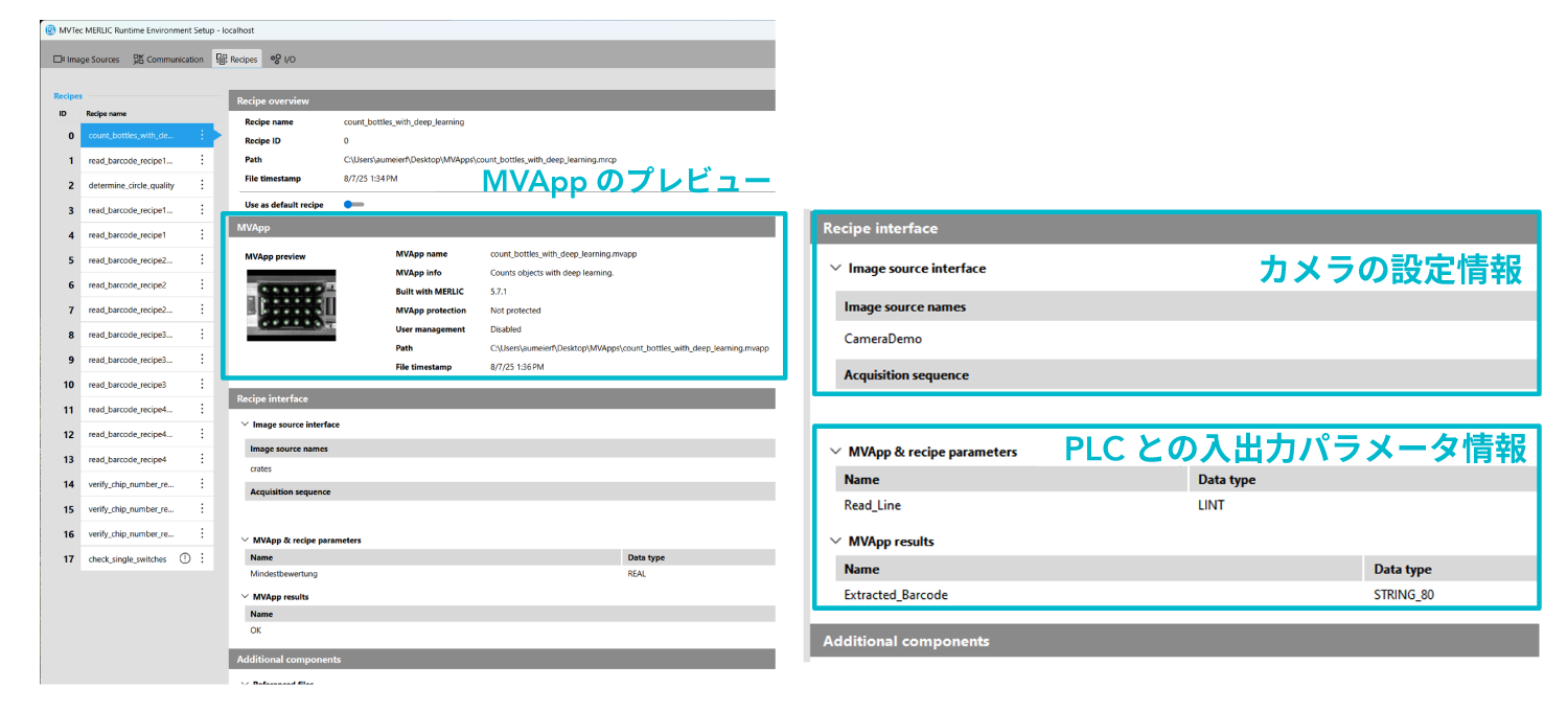 新しいレシピ管理画面では、設定された画像処理プロジェクト(MVApp)のファイル名だけでなく、画像処理ロジックの概要、使用するカメラの設定情報、通信設定の入出力情報なども確認できるようになります。