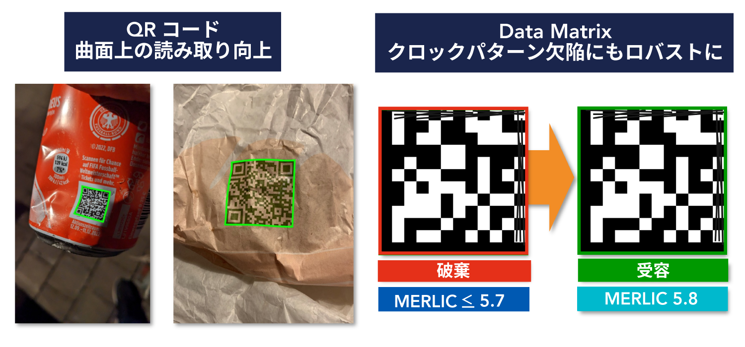 コード読み取り機能はMERLIC 5.7以前のバージョンにも搭載していますが、曲面上のQRコード読み取り性能の向上や、データマトリックスのクロックパターン欠陥を許容するパラメータが追加されました。