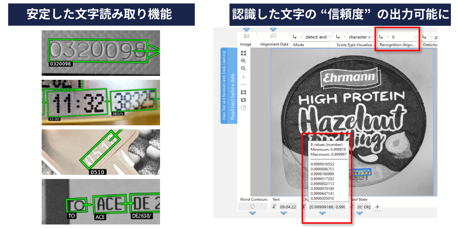MERLICが搭載しているDeep OCRは、開発元のMVTec社にて製造業で使用される様々な文字を事前に学習しており、フォントや文字形態によらず安定した検出が可能な優れた機能です。人が画像中で文字として認識できる対象領域はDeep OCR機能でもかなりの精度で読めるようになっていますが、人でも誤認識しやすい文字に対しても何かしら認識した文字をアウトプットします。今後、信頼度が出力できることで、例えば信頼度に閾値を設定し、スコアの低い文字はアラートを出すような運用にすれば、より精度を重視した文字読み取り機能も実装できるようになります。