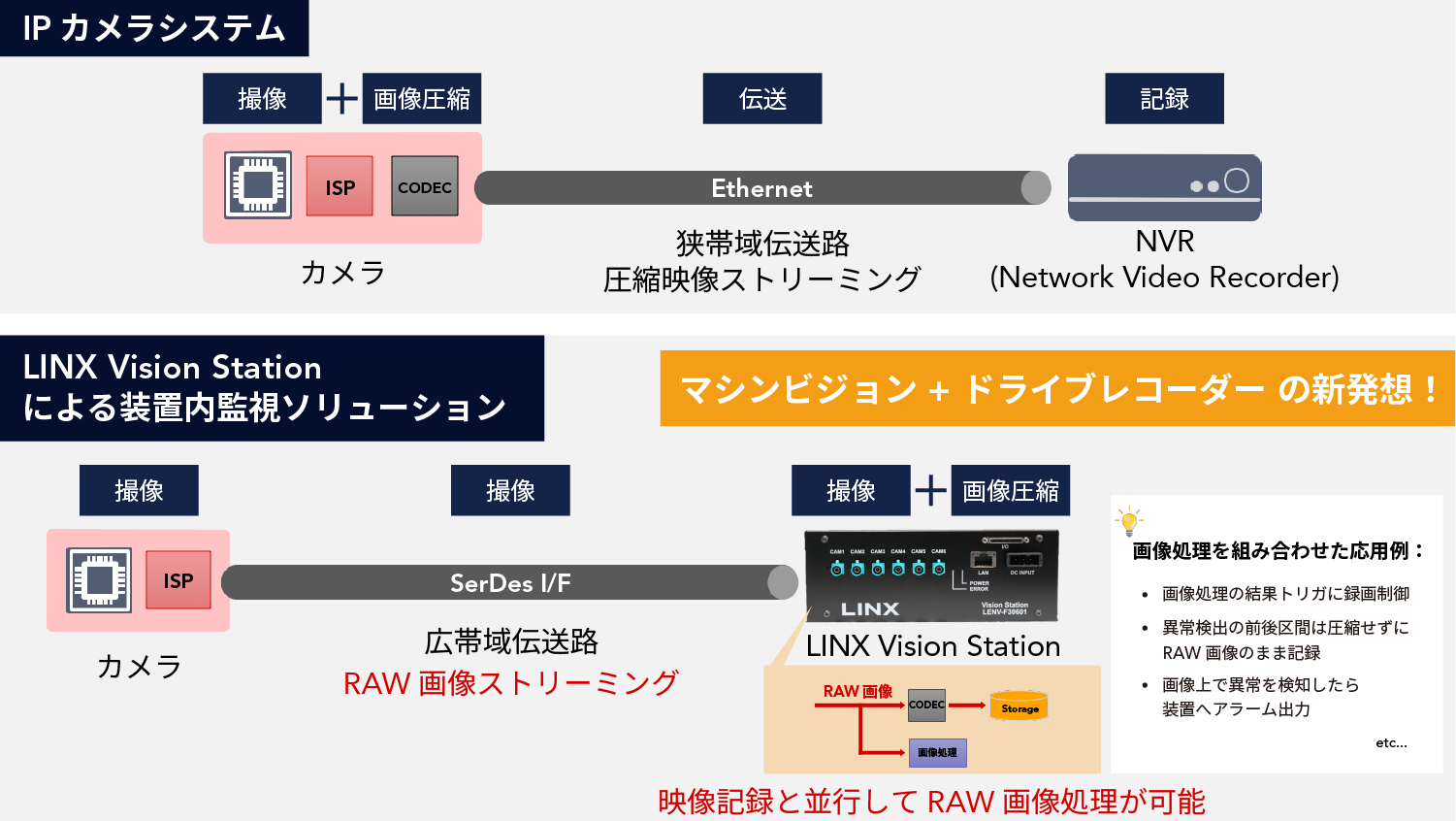 LINX Vision Stationでは、ただ映像を記録するだけではなく、RAW画像処理と録画処理を組み合わせる事で、マシンビジョンとドライブレコーダーを組み合わせた次世代の装置内監視を実現できます。
