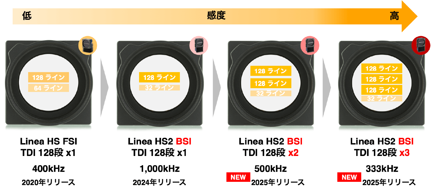 今回リリースになるLinea HS2の各モデルでは、上図に示すように128段のTDIセンサーアレイを最大3つ搭載し、それぞれのアレイ間での電荷の積算を可能にすることで最大384段のTDIとして動作可能です。