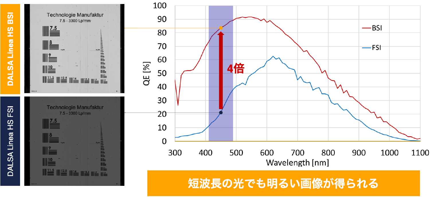 BSIに進化することで、従来と比較して量子効率が格段に向上し、より明るい画像が取得可能になっています。特に、TDIが必要となるような高分解能な検査において高倍率なレンズと組み合わせて使用する場合は、解像力を出すために短波長の照明を使用するケースが多いと思いますが、DALSAのBSIセンサーは短波長側でも十分な量子効率を維持できるように設計されており、明るさと解像力を両立したビジョンシステムの設計を可能にします。