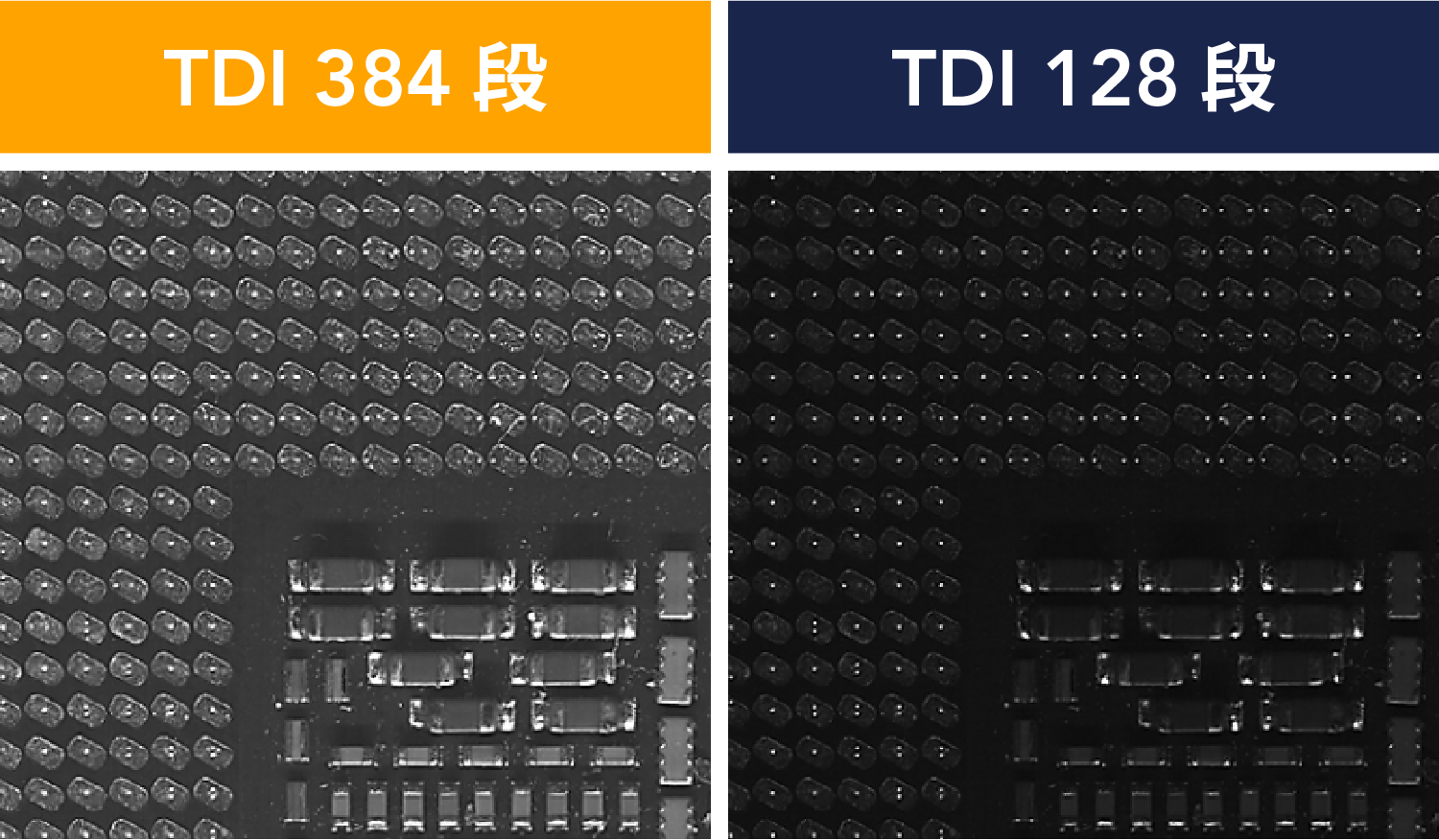 BSI化により、従来のカメラと比較して上述のように大きく感度向上を実現しましたが、TDI段数が3倍になることによってさらなる感度向上を実現しています。以下の画像は、同じ対象物を同じ撮像条件で撮像した際のTDI段数の違いによる明るさを比較した2枚の画像です。TDI段数の増加による効果を一目で理解いただけると思います。