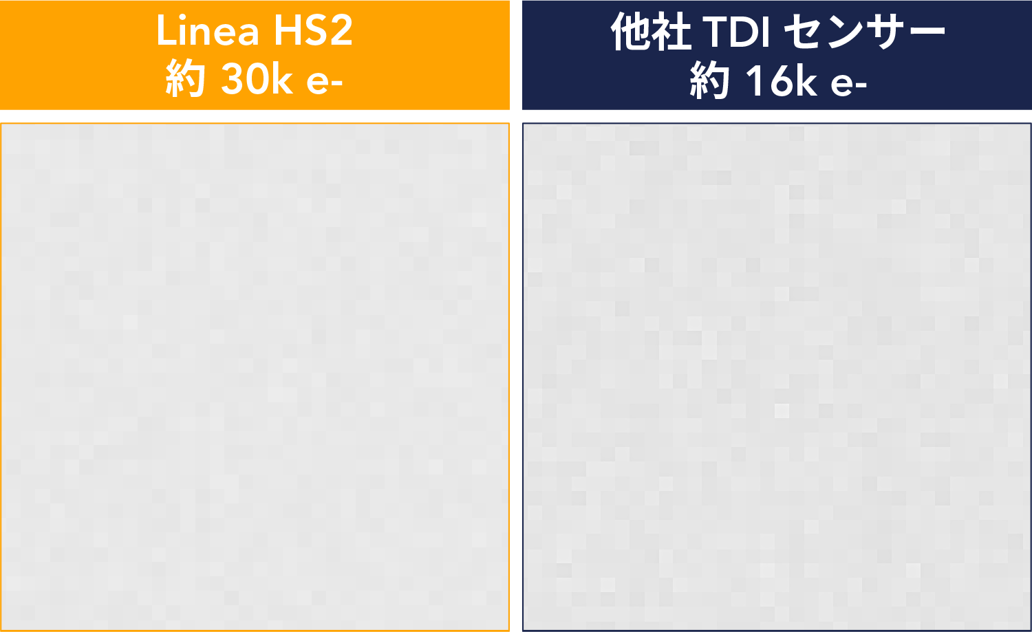 また、Linea HS2に搭載しているセンサーは高い飽和容量(FWC:Full Well Capacity)を有していることも特長です。他社TDIセンサーの飽和容量が約15-16ke-ほどであるのに対し、Linea HS2は約2倍の30ke-となっています。飽和容量を大きくすることの狙いには、微細な輝度差を検出しやすくする、というものがあります。