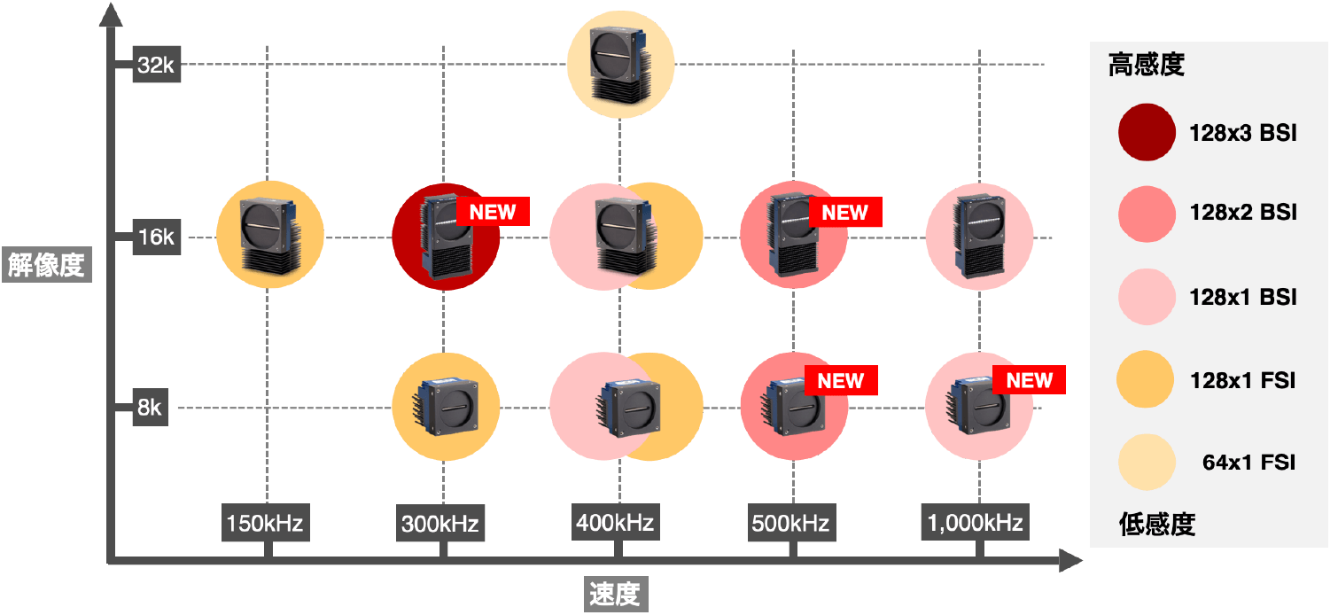 上記では16kを軸として3アレイモデル、2アレイモデルのご紹介をしました。Linea HS2は16kからリリースをしてきましたが、8kモデルもラインナップに加わります。8kでは、128段のTDIセンサーアレイを1つ搭載し1MHzを実現するモデルと、2つ搭載したモデルをラインアップします。
