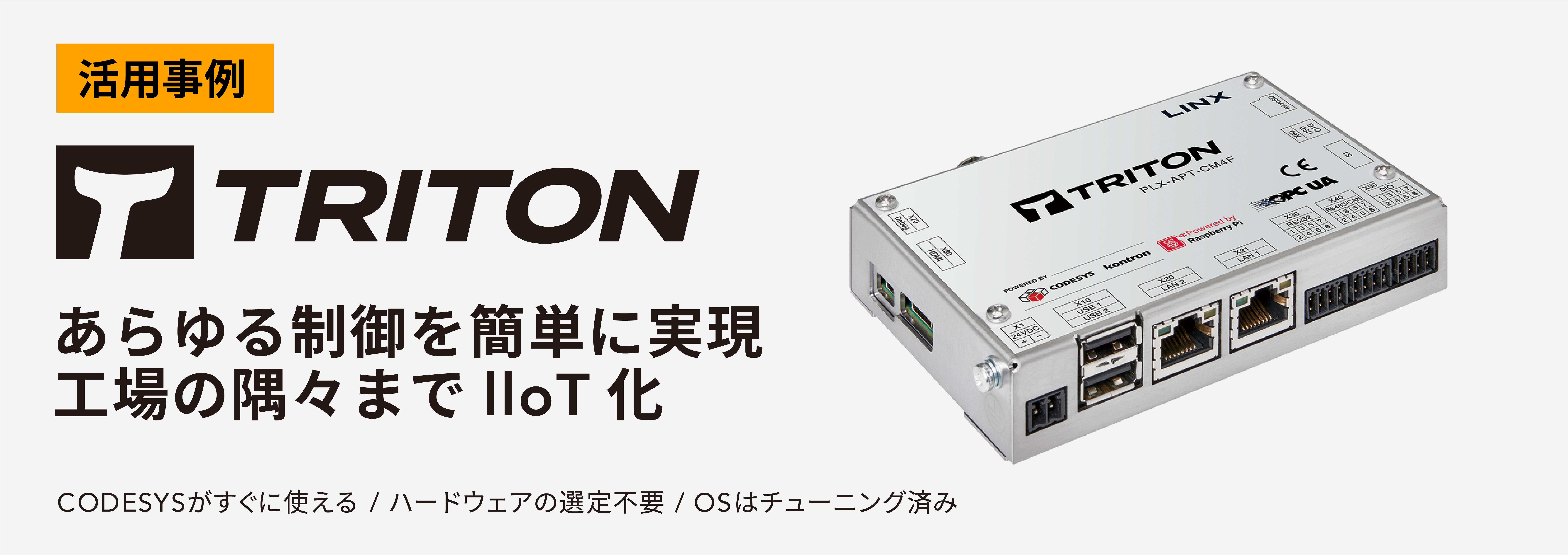 『TRITON』は、コストパフォーマンスに優れた高性能のハードウェアとチューニング済みのOSにソフトウェアPLC【CODESYS】をパッケージしたオールインワンのPLCです。