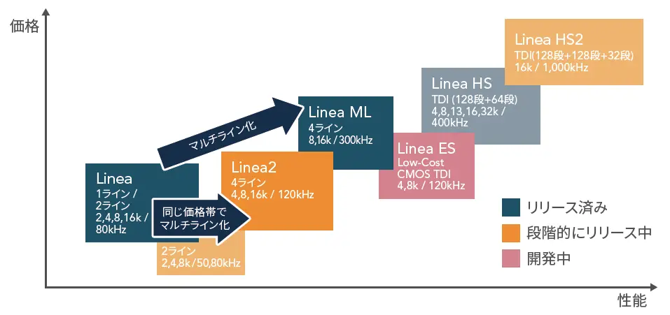 Linea2はLineaと同等価格でマルチラインカメラを提供できるようになっており、Linea MLの廉価版の側面だけでなく、Lineaの性能アップの側面も持ち合わせています。