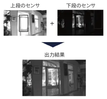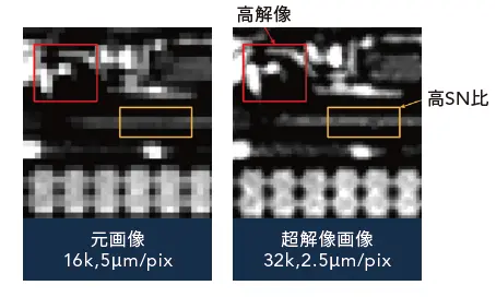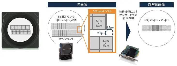 1/2ピクセルずらした2つのセンサで撮像した2枚の画像を、特許技術によるオンボードの合成処理にかけることにより32kのSuper Resolution(超解像)画像を出力します。
