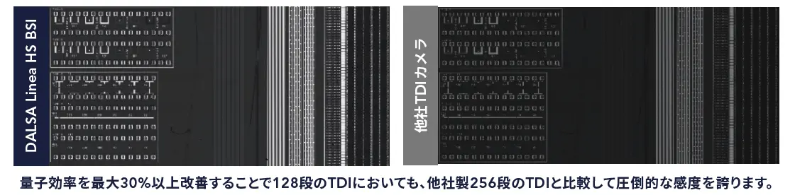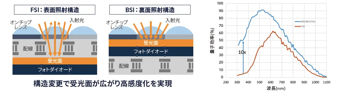 ラインスキャンセンサにBSI (裏面照射)技術を搭載し、従来のカメラと比較して可視光帯からUV帯まで大幅に量子効率を向上し、高感度な画像を撮像可能です。