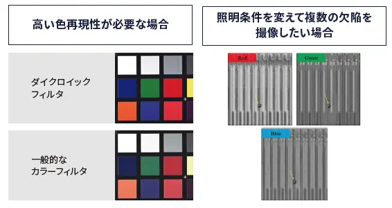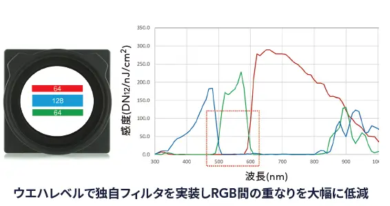 3板式カメラのプリズムにも使用される技術であるDichroic Filtersをウエハレベルで実装することで高い色再現性を実現しています。また、RGB間の感度の重なりを最小限に抑え込むことで、RGBそれぞれの照明と組み合わせて3台のモノクロカメラのように使用することもできます。